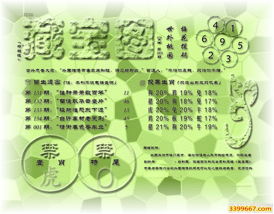 | 主题 :001期藏寶圖 新:郊外黄垓端可厌 老:晴街春色香车立 禁:虎 禁:0尾 |
