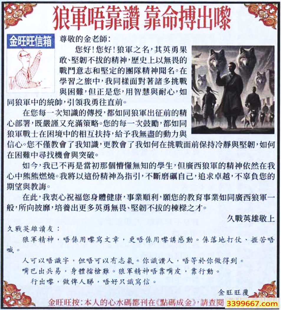 | 主题 :002期:金旺旺信箱彩民推荐→→《狼軍唔靠讃 靠命搏出嚟》 |