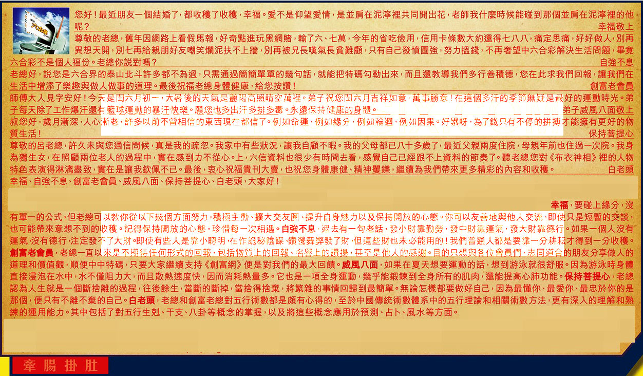 【6】.尊敬的呂老總,許久未與您通信問候,真是我的疏忽。我家中有些狀況,讓我自顧不暇。我的父母都已八十多歲了,最近父親兩度住院,母親年前也住過一次院。我身為獨生女,在照顧兩位老人的過程中,實在感到力不從心。上,六信資料也很少有時間去看,感覺自己已經跟不上資料的節奏了。聽老總您對《布衣神相》裡的人物特色表演得淋漓盡致,實在是讓我欽佩不已。最後,衷心祝福貴刊大賣,也祝您身體康健、精神矍鑠,繼續為我們帶來更多精彩的內容和收穫。  白老頭