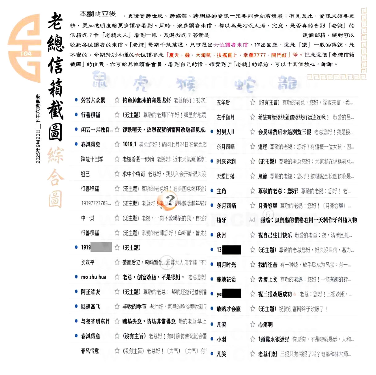 | 主题 :104期:六合皇金句/老总论码/萧公子/林大师/五行夺码/老总信箱截 |
