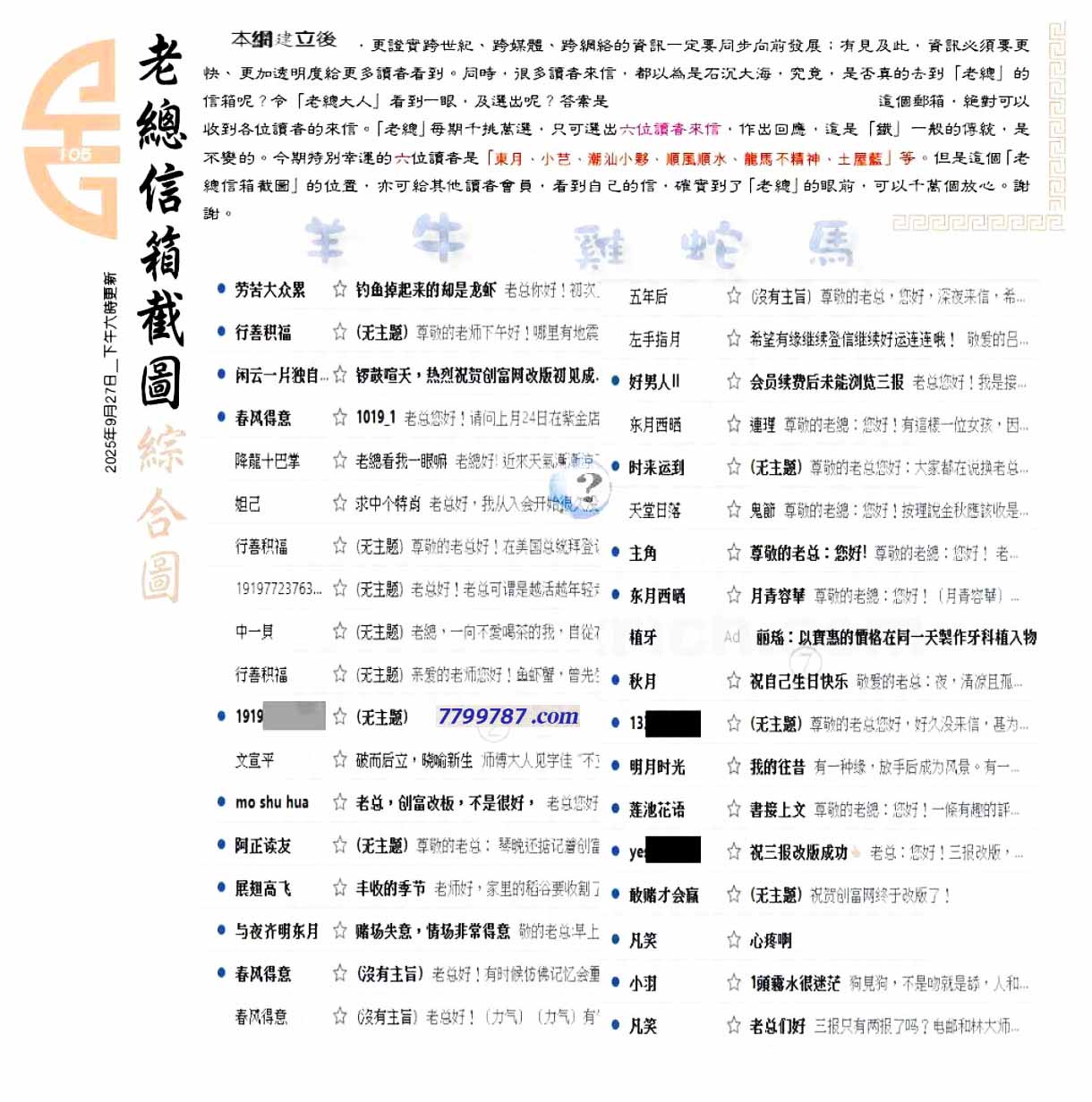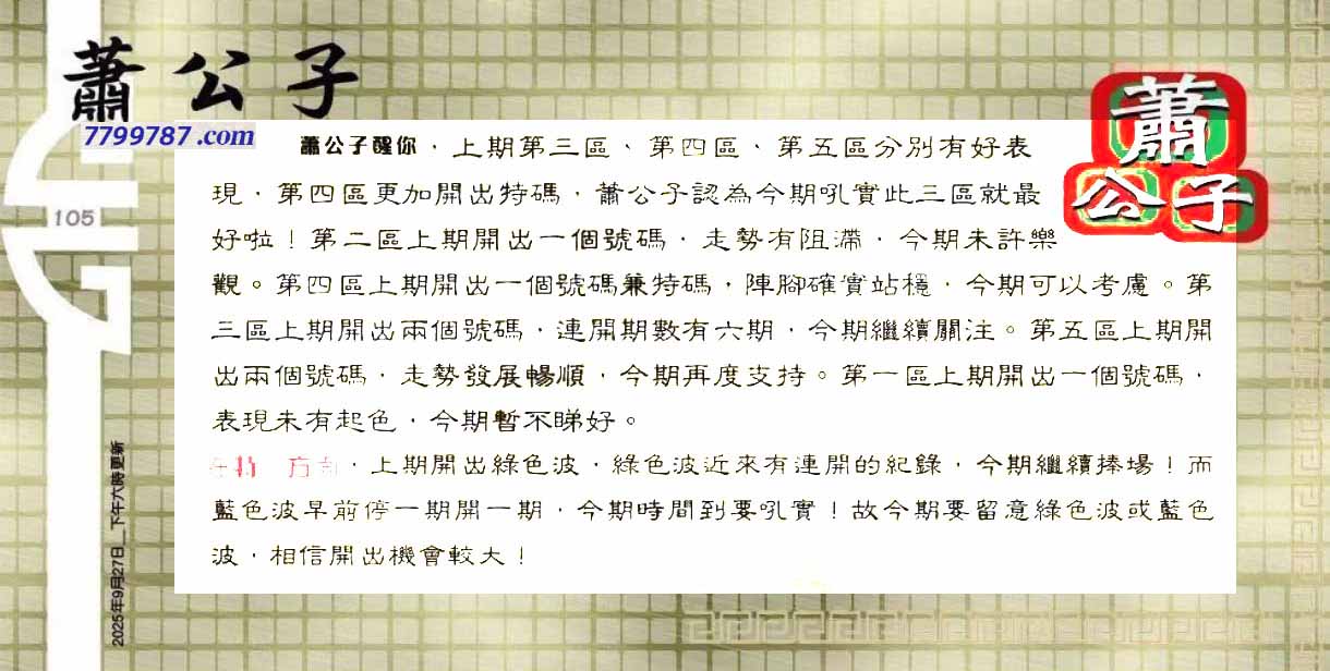 | 主题 :105期:六合皇金句/老总论码/萧公子/林大师/五行夺码/老总信箱截 |
