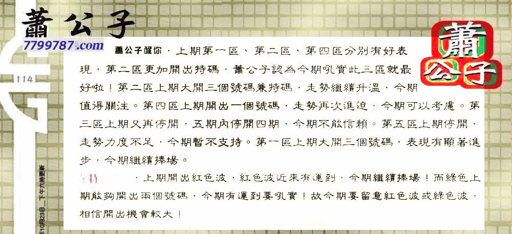 | 主题 :114期:六合皇金句/老总论码/萧公子/林大师/五行夺码/老总信箱截 |