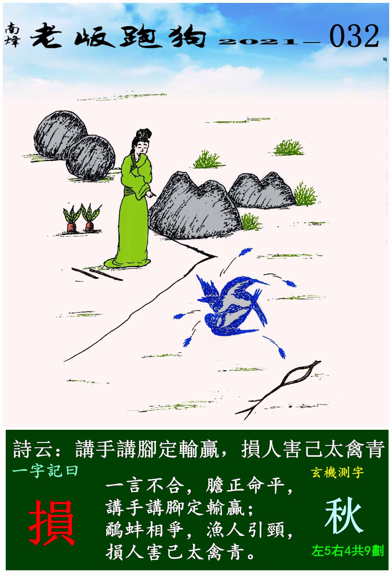 032期老版跑狗一字記之曰:【損】玄機測字:《倆》