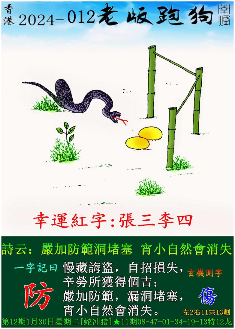 012期老版跑狗一字記之曰:【防】 玄機測字:《傷》