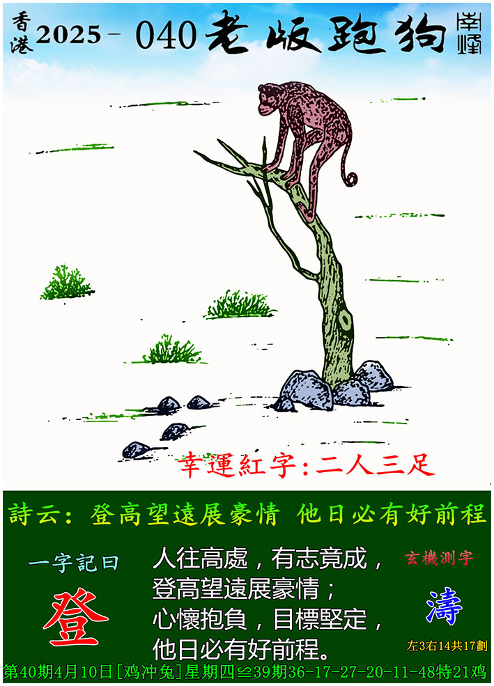 主题 : 040期老版跑狗一字記之曰:【登】 玄機測字:《濤》