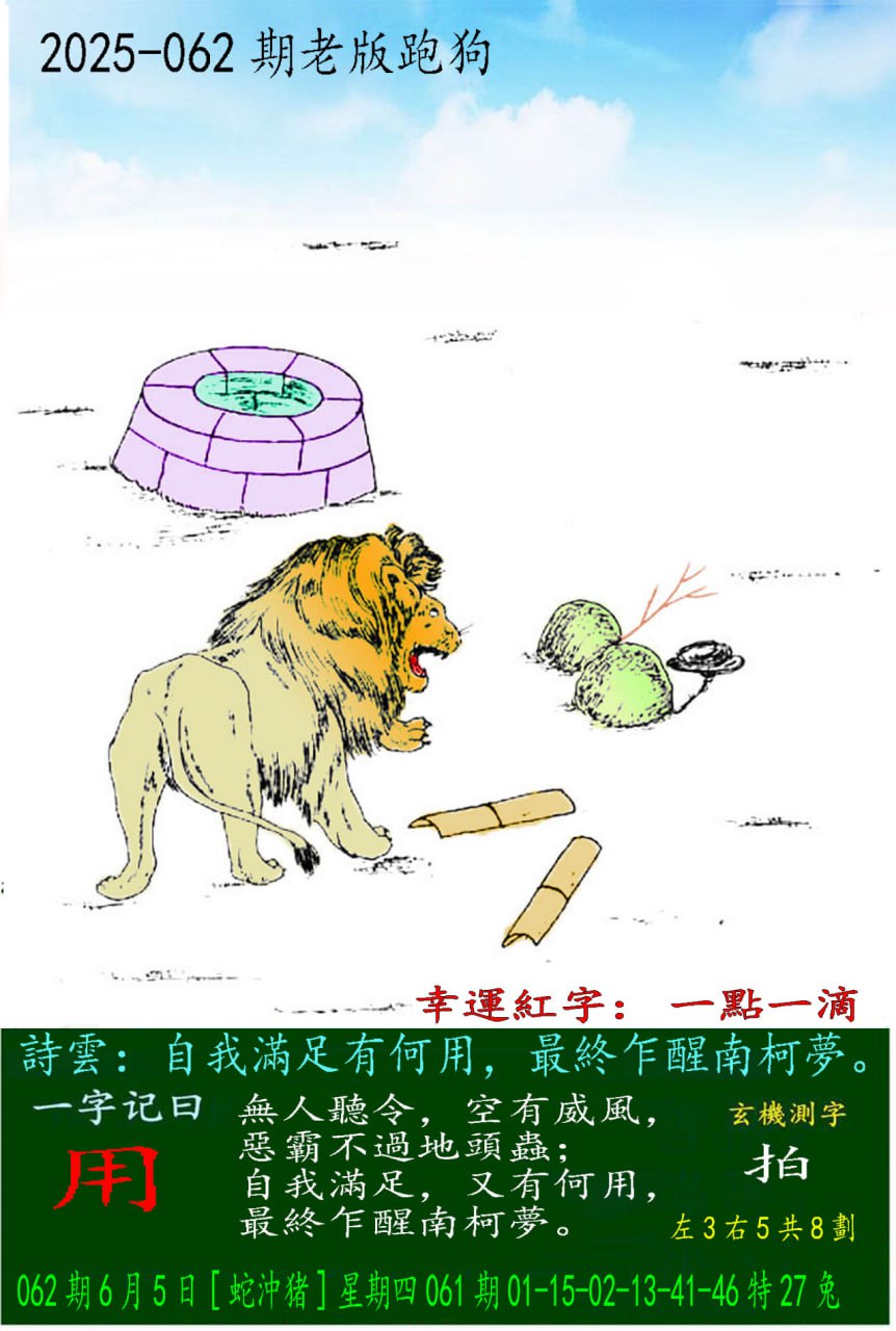 主题 : 062期老版跑狗一字記之曰:【用】 玄機測字:《拍》