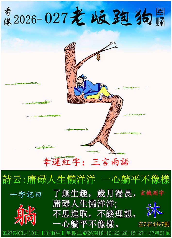 主题 : 027期老版跑狗一字記之曰:【躺】 玄機測字:《沐》