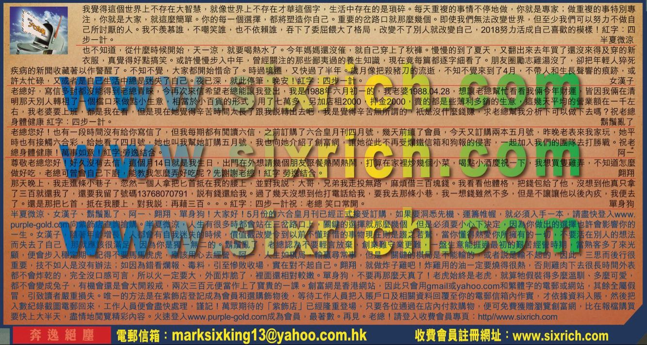 【4】老總您好!也有一段時間沒有給你寫信了,但我每期都有閲讀六信,之前訂購了六合皇月刊四月號,幾天前續了會員,今天又訂購兩本五月號,昨晚老表來我家玩,她平時也有接觸六合彩,給她看了四月號,她也叫我幫她訂購五月號,我也向她介紹了創富網,讓她從此不再受爛鐵信箱和狗報的侵害,一起加入我們的團隊去打勝戰,祝老總身體健康!萬事如意!紅字:勞逸結合。 ---阿一