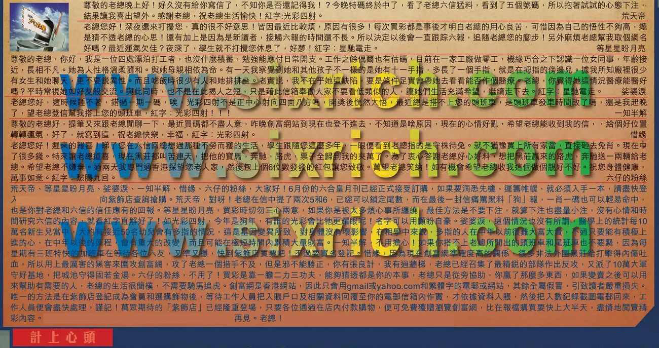 →〖荒天帝〗對呀!老總在信中提了兩次5和6,已經可以鎖定尾數,而在最後一封信痛罵黑料「狗」報,一肖一碼也可以輕易命中,也是你對老總和六信的信任應有的回報。