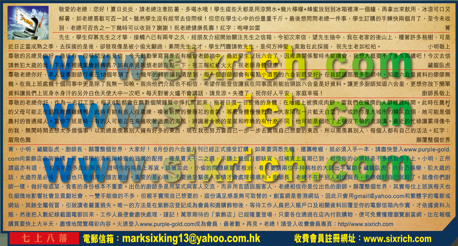 【3】尊敬的呂總見信好,最近一段時間沒有見信,今天動動筆寫寫是否有機會老師抽中,最近學生沒玩六合了,因經濟關係暫時未能續會, 我想大概要不了多久再續吧!今次去信請教犯太歲的我 ,下半年裡運氣會好轉嗎?如有幸見報煩老師指點一下,祝三報紅紅火火,祝老師身體健康! ---藏龍臥虎