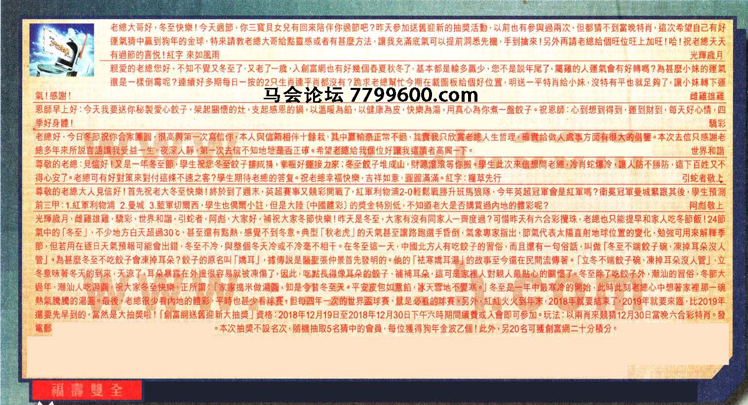 【1】老總大哥好,冬至快樂!今天過節,你三寶貝女兒有回來陪伴你過節吧?昨天參加送舊迎新的抽獎活動,以前也有参與遍兩次,但都猜不到當晚特肖,這次希望自己有好運氣猜中贏到狗年的金球,特來請教老總大哥給點靈感或者有甚麼方法,讓我充滿底氣可以提前洞悉先機,手到擒來!另外再請老總給個旺位旺上加旺!哈!祝老總天天有過節的喜悦!紅字來如風雨 ---光輝歲月