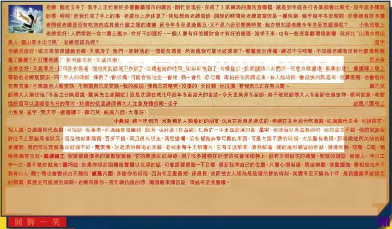 【1】.老總:臨近立冬了,我手上正忙著好多個醫藥超市的廣告,剛忙到現在,完成了 3 家藥局的廣告宣傳檔,越是到年底各行各業都會比較忙,趁年底多賺點鈔票,呵呵!而我忙完了手上的事,老婆也上床休息了,我就想給老總寫信,閒餘的時間給老總寫寫信是一種快樂,幾乎每年冬至期間,好像總有許多讀者問候老總是否有吃狗肉或其他什麼之類的進補,而今年冬至是逢週五,又不是六合彩開獎時間,我亦想知道老總今年冬至怎麼過呢?  小魚兒
