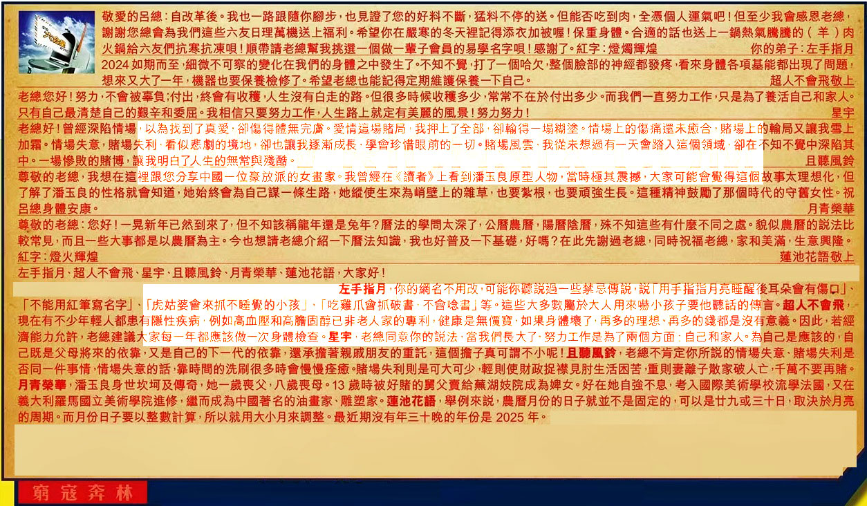 【1】.敬愛的呂總:自改革後。我也一路跟隨你腳步,也見證了您的好料不斷,猛料不停的送。但能否吃到肉,全憑個人運氣吧!但至少我會感恩老總,謝謝您總會為我們這些六友日理萬機送上福利。希望你在嚴寒的冬天裡記得添衣加被喔!保重身體。合適的話也送上一鍋熱氣騰騰的(羊)肉火鍋給六友們抗寒抗凍唄!順帶請老總幫我挑選一個做一輩子會員的易學名字唄!感謝了。紅字:燈燭輝煌 你的弟子:左手指月