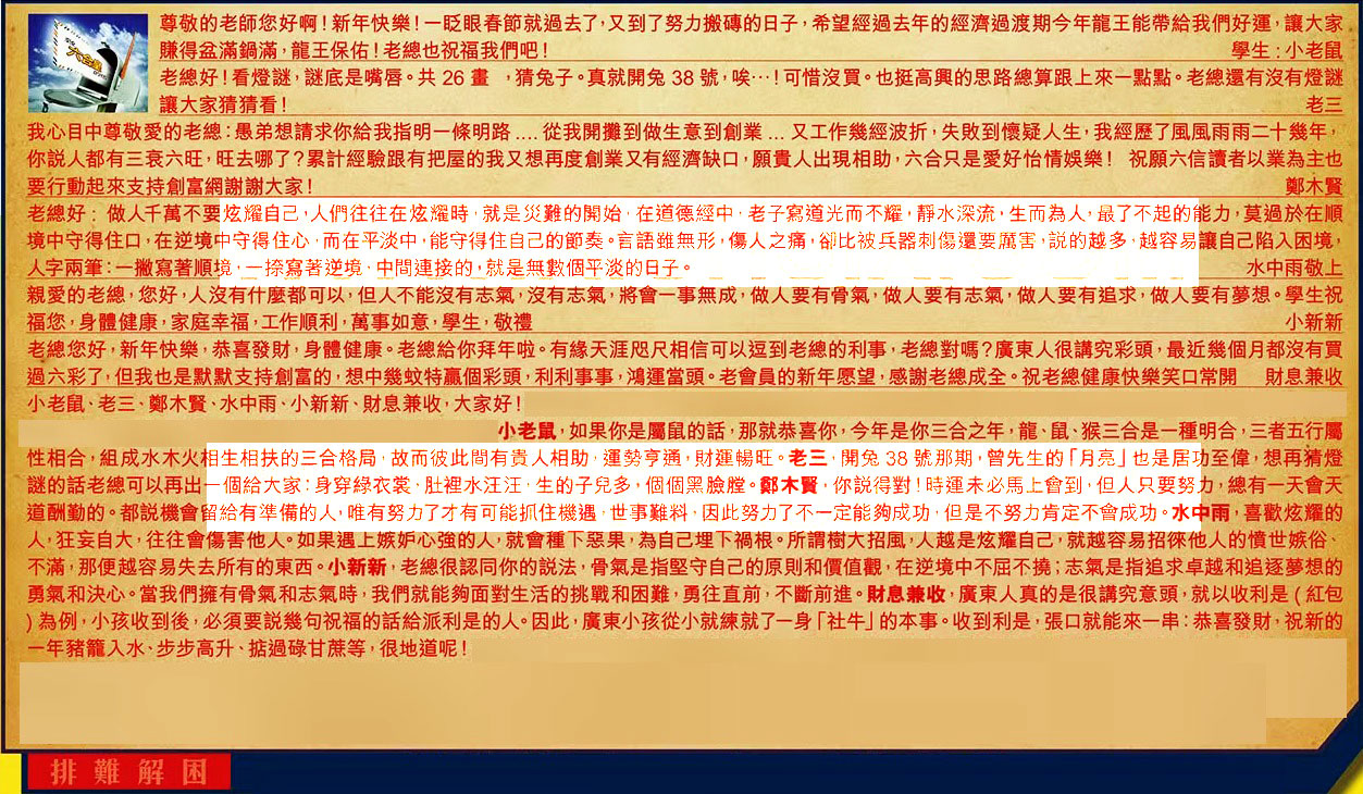 →〖老三〗:開兔 38 號那期,曾先生的「月亮」也是居功至偉,想再猜燈謎的話老總可以再出一個給大家:身穿綠衣裳,肚裡水汪汪,生的子兒多,個個黑臉膛。