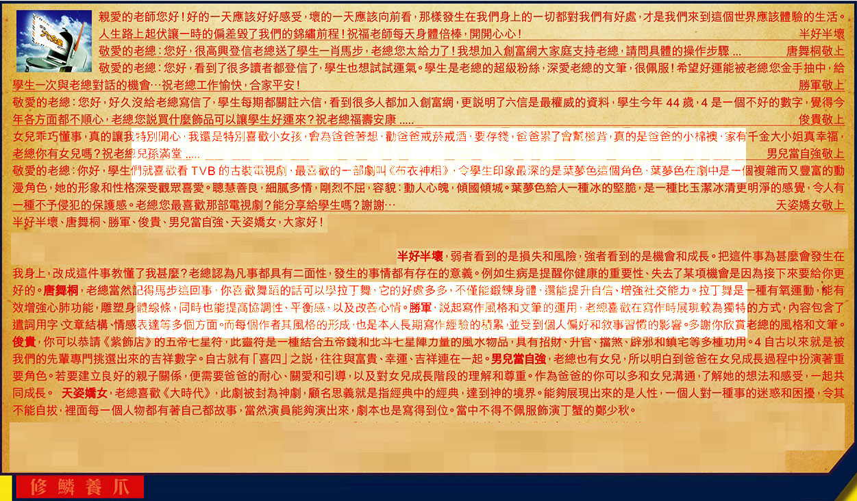 【4】.敬愛的老總:您好,好久沒給老總寫信了,學生每期都關詿六信,看到很多人都加入創富網,更說明了六信是最權威的資料,學生今年44歲,4是一個不好的數字,覺得今年各方面都不順心,老總您說買什麼飾品可以讓學生好運來?祝老總福壽安康..... 俊贵敬上