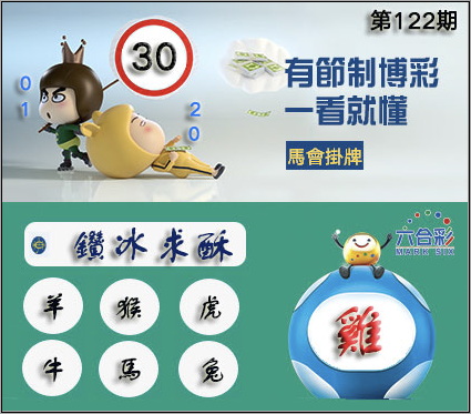 122期正版彩图挂:30 爆:鸡 挂牌成语:钻冰求酥 挂牌出肖:羊猴虎牛马兔