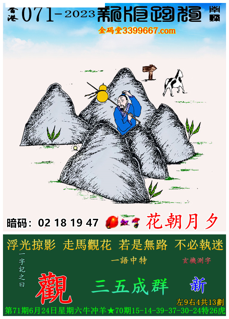 071期:新版跑狗一字記之曰【觀】玄機測字:《新》
