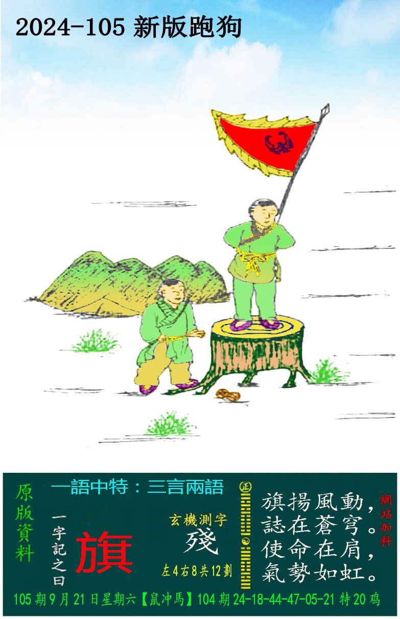 主题 : 105期:新版跑狗一字記之曰【旗】 玄機測字:【殘】