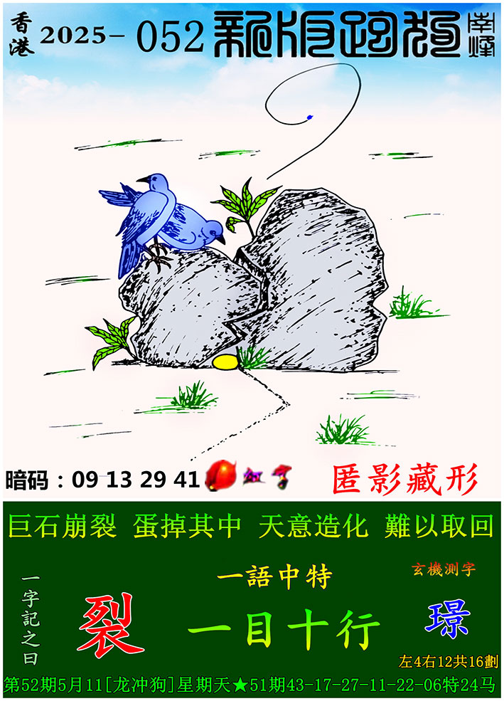 052期:新版跑狗一字記之曰【裂】 玄機測字:【璟】