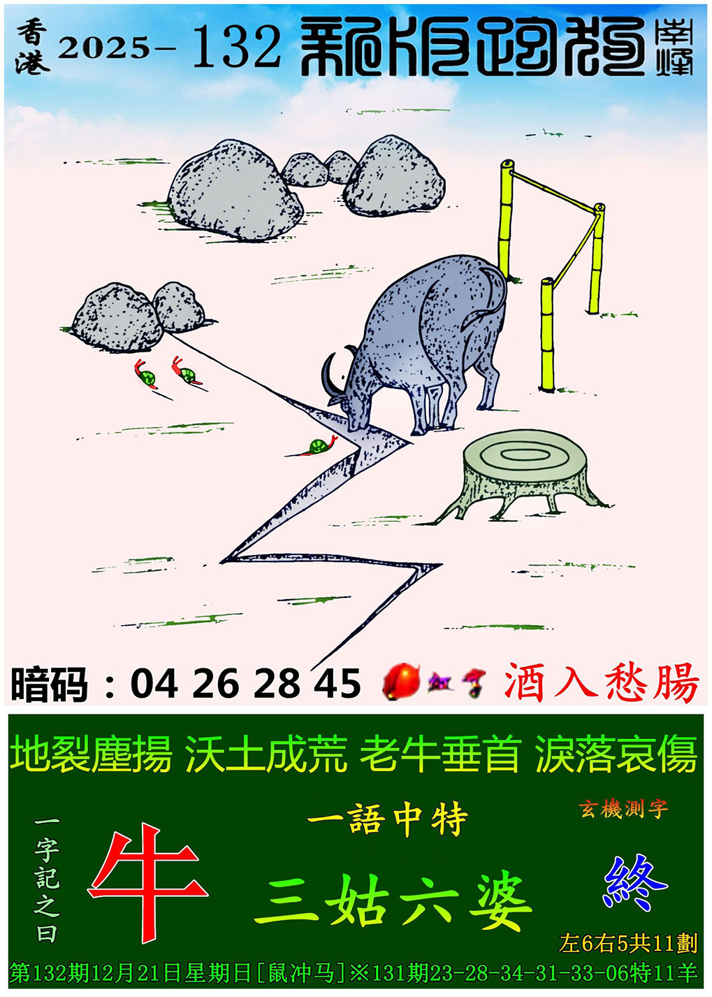 132期:新版跑狗一字記之曰【牛】 玄機測字:【終】